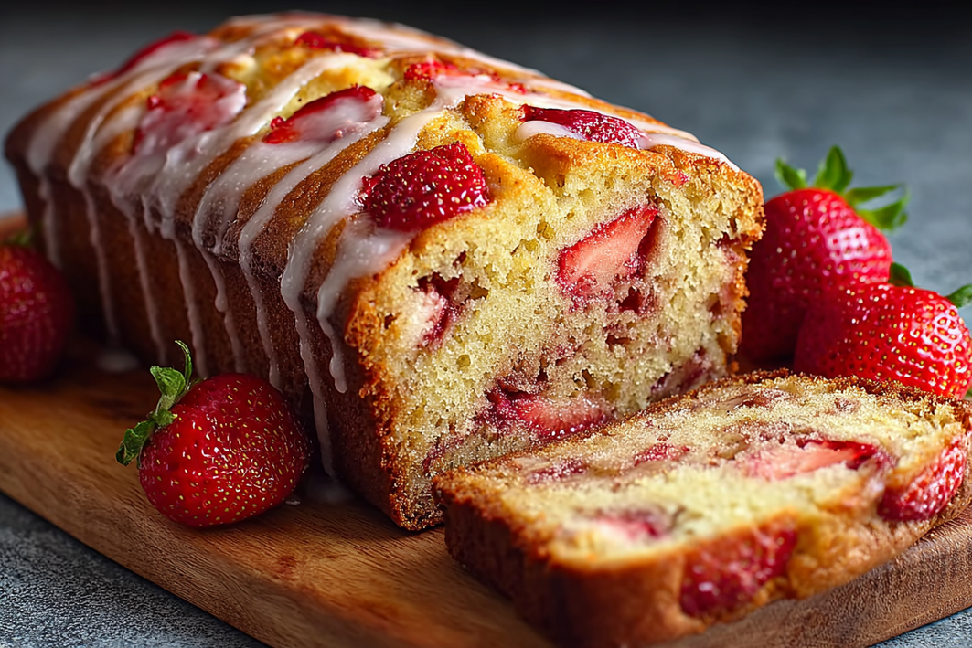 - The fresh strawberries add a lovely fruity flavor and a bit of vibrant color throughout the loaf.